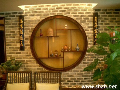 這款就是純中式的玄關設計了,圓形的博古架,擺放著各種很有質感且很有價值的裝飾品,更體現(xiàn)出了中式傳統(tǒng)的感覺,而兩邊的對聯(lián),則是中國最傳統(tǒng)的文化,整個區(qū)域空間盡顯傳統(tǒng)風味。