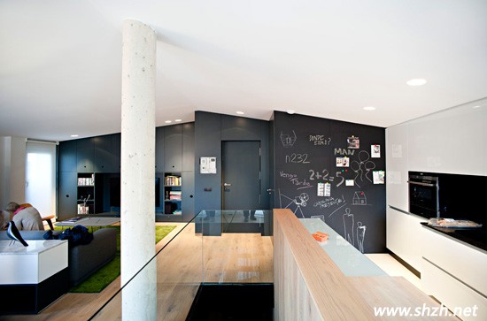 黑白為主色調(diào)的客廳空間,一點(diǎn)也不顯得枯燥乏味,莊重而典雅的感覺。而且前面的設(shè)計(jì),設(shè)計(jì)師考慮到空間的單調(diào)性,特地制作了墻面彩繪,可以在上面隨意的寫字畫畫,比如可以記錄下今天的生活心情或者工作內(nèi)容,亦或者教小孩讀書寫字,讓單調(diào)的空間瞬時(shí)變得活力十足,生動(dòng)而有趣。而且,也正好是這樣才會的方式,巧妙的將客廳廚房鏈接了起來,自然的過渡,創(chuàng)意十足。