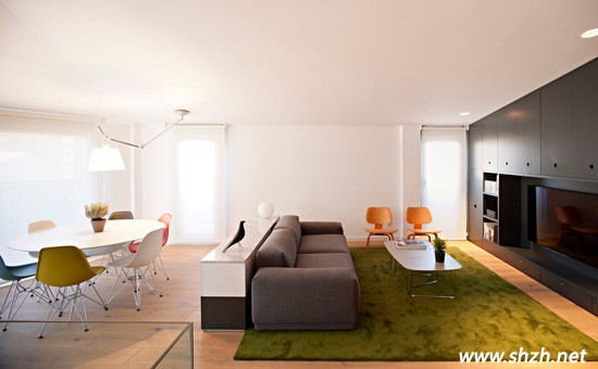 再來細(xì)看客廳的布局,一塊綠色的地毯就足以將客廳與餐廳嚴(yán)格區(qū)分了開來,非常巧妙的鋪設(shè),而且色彩的選擇上也恰到好處,不會顯得特別的生硬。灰色的沙發(fā),似乎略顯單調(diào),但是,如果用吧臺作為沙發(fā)背景墻,那就有趣多了,不僅可以作為隔斷,休閑之余,還能在此喝茶聊天,或者與愛人一同品酒,是那樣的充滿樂趣。