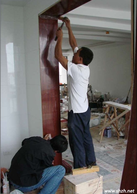 1、過(guò)門石、大理石窗臺(tái)的安裝。過(guò)門石的安裝可以和鋪地磚一起完成,也可以在鋪地磚之后,大理石窗臺(tái)的安裝一般在窗套做好之后,安裝大理石的工人會(huì)準(zhǔn)備玻璃膠,順手就把大理石和窗套用玻璃膠封住了。