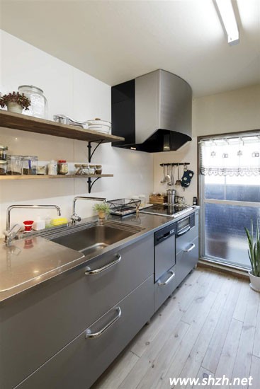 不銹鋼的整體櫥柜簡潔明亮,而且大的抽屜櫥柜擁有強(qiáng)大的收納功能,而上面用木板搭制成收納區(qū)域,可以放各種調(diào)味品、餐具和廚具,非常方便拿取,有利于廚房區(qū)域的保潔。