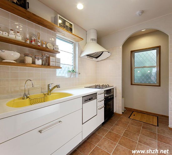 這款設(shè)計(jì),非常具有特色,黃色的洗手池,翹皮可愛,充滿了活躍的氛圍。而白色的櫥柜,顯得干凈整潔,大大小小的抽屜擁有非常強(qiáng)大的收納功能,而且全部采用門柜設(shè)置,很好的保護(hù)了私密性。櫥柜上面的隔板打造收納區(qū)域,放置不同的廚房用品、瓶瓶罐罐,奏出廚房完美的樂章。