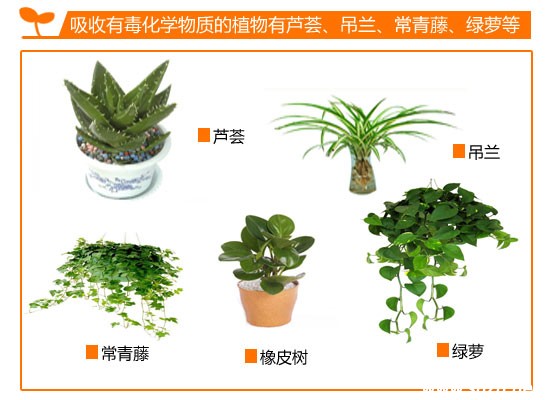新房子裝修后通常會有甲醛污染的擔(dān)憂,人們往往會在室內(nèi)放置蘆薈、吊蘭、虎尾蘭等植物來吸收有害化學(xué)物質(zhì),有研究表明,虎尾蘭和吊蘭可吸收室內(nèi)80%以上的有害氣體,吸收甲醛的能力超強(qiáng);蘆薈,可以吸收1立方米空氣中所含的90%的甲醛。除此之外,綠蘿、一葉蘭、龜背竹、常青藤、鐵樹、菊花、山茶等都可以有效清除空氣中的有害物質(zhì)。