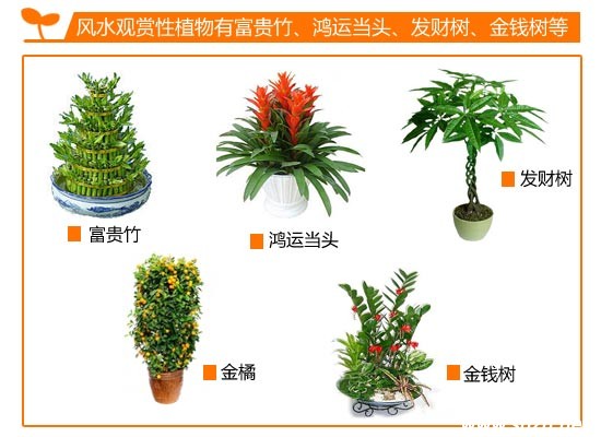 富貴竹、鴻運(yùn)當(dāng)頭、蓬萊松、七葉蓮、發(fā)財(cái)樹、金錢樹、招財(cái)樹、君子蘭、蘭花、仙客來、桔等植物因?yàn)槠涿Q蘊(yùn)含吉祥如意、恭喜發(fā)財(cái)?shù)脑⒁猓H受人們歡迎,被當(dāng)做家居風(fēng)水的裝飾常客。