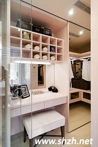 主臥室的更衣室、化妝間,與餐廳共享一面墻,鏡面后方的空間正是大冰箱的后半部,鏡面上下藏有軌道,朋友來時,門一拉就將化妝臺整個藏起來。