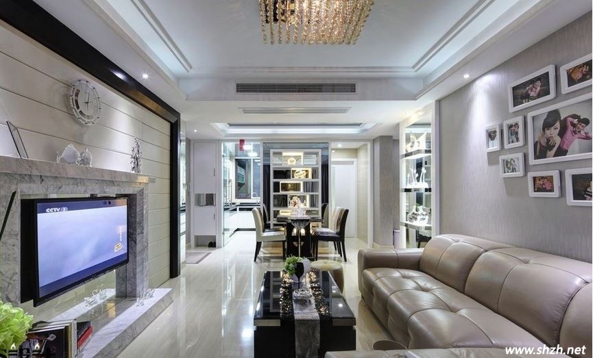 我們再來看這款簡歐客廳設(shè)計,它的亮點(diǎn)莫過于吊頂?shù)难b飾了。簡約的裝飾,在燈光的照射下,變得那樣的柔和、那樣唯美。博古架上的裝飾物,因為有了燈光,才會變得那樣的活靈活現(xiàn),完美至極。而皮質(zhì)的沙發(fā),看起來更是那樣的有質(zhì)感,墻壁上的相框打造的照片墻,可以隨時欣賞快樂的瞬間,給生活也增添了一份回憶的色彩。這款設(shè)計的重點(diǎn),除了要有美觀時尚的家居外表,還需要有生活樂趣的點(diǎn)點(diǎn)滴滴,這樣的居住空間,真的是非常讓人向往。