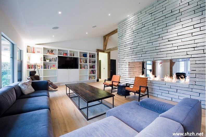 我個人很喜歡這款設(shè)計,藍(lán)色的布藝沙發(fā),帶著海洋的味道,還有些浪漫。而背景墻的設(shè)計也十分的有個性。整個裝飾,有種面朝大海,春暖花開的感覺。