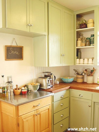 巧妙之處在于在轉(zhuǎn)角處打造了兩個(gè)不同造型的收納櫥柜。一個(gè)是設(shè)置了柜門,另一個(gè)則打造成格子狀,擺放經(jīng)常使用的瓶瓶罐罐,拿取也是非常方便的。并且以嫩綠色和原木色相間的整體櫥柜也能給小小的廚房帶來(lái)一抹清涼的感受。各種烹飪工具及廚房用具都干凈整齊的擺放在櫥柜上,不凌亂且能帶來(lái)美觀的效果。