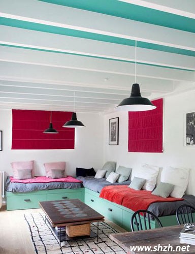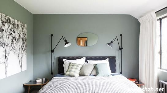 臥室是休息的重要場所,人的一天1/3的時(shí)間是在床上度過的,因此,臥室一定要以溫馨舒適,能有助于人的睡眠為主。這款設(shè)計(jì)就特別的簡單溫馨。淡綠色;與白色相搭配就是挺不錯(cuò)的視覺效果。而且映入眼簾的床頭那一面不規(guī)則鏡子也是很有趣味的,裝飾效果非常好。