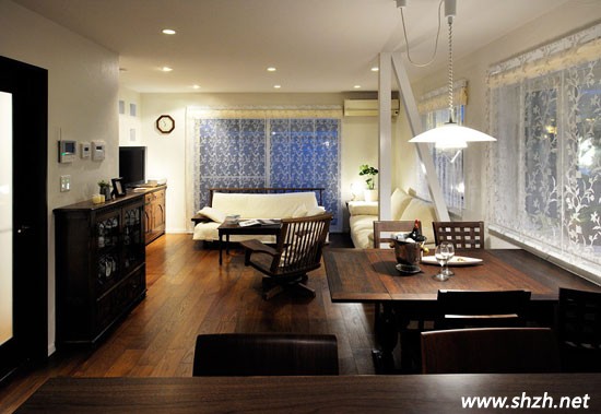 日式風(fēng)格設(shè)計喜歡采用原木裝扮家居,非常特近大自然的生活環(huán)境??蛷d的設(shè)計,一眼忘去映入眼簾的則是深木色的地板,紋理清晰可見,自然氣息濃厚。同樣餐桌也是采用原木作為材質(zhì),整個空間不僅搭配和諧,還具有立體感。但是,居室的其它區(qū)域,卻明顯的呈現(xiàn)出現(xiàn)代時尚的感覺。比如白色的布藝沙發(fā),顯得干凈整潔,寬敞舒適,使得單一的空間有了一絲時尚的味道。窗簾的選擇上也別具個性,鑲嵌白色的花紋,顯得更加的浪漫溫馨。