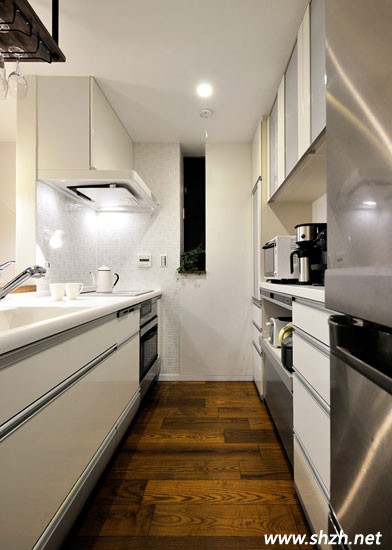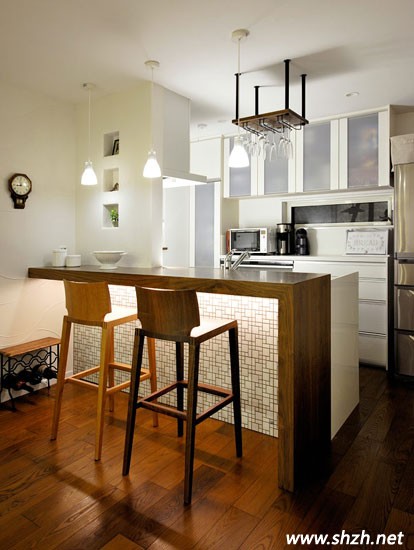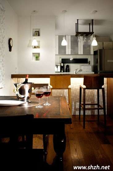 客廳給我們的印象不僅充滿日式的風(fēng)味,還擁有現(xiàn)代時尚的氣息。而廚房的設(shè)計,木質(zhì)搭成了一個小吧臺,款式簡單,卻依舊清新靚麗。兩張細(xì)高的座椅,原木打造,卻別有一番風(fēng)味,造型獨(dú)特美觀,不失時尚性。白色的廚房空間,提升了空間的亮度,視覺上更加寬敞。也許你并沒有在意角落里的那個小小酒架,但這樣的設(shè)計卻盡顯溫馨浪漫,將幾瓶紅酒插入,拿取也很方便,夫妻小兩口在此品酒聊天,浪漫無比。
