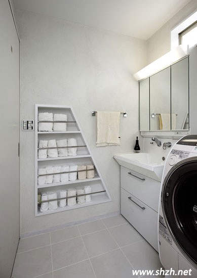 白色的衛(wèi)浴間設(shè)計,寬敞明亮,內(nèi)嵌式的架子,分層擺放毛巾,毛巾的色彩也能將小小的空間裝飾的活潑可愛。白色的水池,下面設(shè)置了兩個大的抽屜,擺放日用品,保證了衛(wèi)生間的干凈整潔。而鏡子則由三塊鏡子拼湊而成,一定程度上擴(kuò)大了視覺空間,使得整個區(qū)域更具有靈動性與立體感。