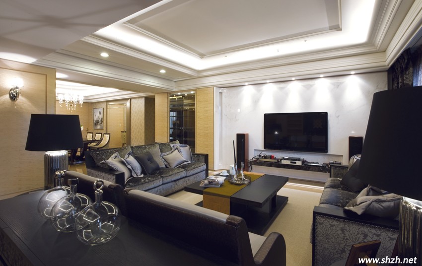 因?yàn)榭蛷d空間夠?qū)挸?,也為了加?qiáng)家中交誼娛樂的機(jī)能性,設(shè)計(jì)師特地將玄關(guān)進(jìn)門右側(cè)轉(zhuǎn)角處規(guī)劃成L型的輕食吧臺(tái)區(qū),除了預(yù)留小冰箱位置,還有光潔臺(tái)面與輕盈的上下柜設(shè)計(jì),背襯鏡面的手法,也讓空間角落因?yàn)楣庥暗姆瓷涠迂S富。而客廳兩張單椅后方的區(qū)域,自然而然形成一方可以輔助客廳,情韻悠閑的休憩場(chǎng)域,而一旁剛好呼應(yīng)電視主墻的副墻造型,在墻面正中以石材精工打造的古典壁爐為軸心,兩側(cè)安排對(duì)稱的活動(dòng)格柜,可隨主人喜好變換硬件造型,貫徹兼具實(shí)用與裝置藝術(shù)的設(shè)計(jì)概念,壁爐前的開放空間,則結(jié)合單品家具完成兩者的空間界定,整體洋溢人文興味濃厚的新奢華氣息。
