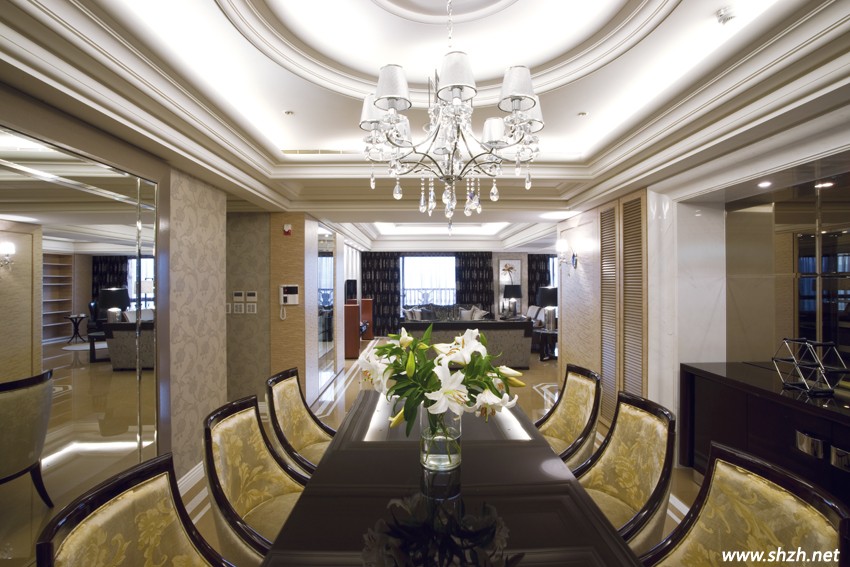 同樣與客廳相鄰的餐廚區(qū),沿著走出玄關(guān)左轉(zhuǎn)的主要?jiǎng)泳€,隨即進(jìn)入客、餐廳間的緩沖地帶。餐廳上方多層次的天花造型,融合圓、方以及復(fù)式線條間的幾何變化,輝映水晶燈飾,與氣質(zhì)優(yōu)雅的古典餐桌椅組合形成親昵的對(duì)話,兩端還有典雅的百頁餐柜設(shè)計(jì)提升生活便利性,特別是墻體中央導(dǎo)角拼接的茶鏡背景,為視覺帶來低調(diào)的鏡面開窗效果,空間感更為開闊。
