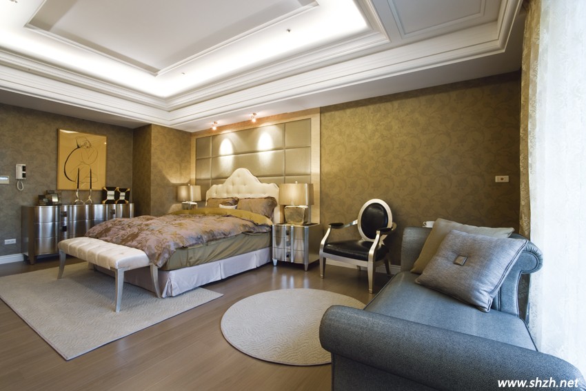 極度優(yōu)雅的主臥空間內(nèi)部機(jī)能動(dòng)線的分配十分從容,既富有風(fēng)情萬種的新古典魅力,也能嗅到現(xiàn)代風(fēng)格的人文內(nèi)涵。整體布局上總計(jì)劃分為沉穩(wěn)、奢華的睡眠區(qū)、床尾兩側(cè)分別為專屬衛(wèi)浴與精美更衣間,低調(diào)優(yōu)雅的壁紙圖騰與沉穩(wěn)的木色相互輝映,床頭造型則以柔軟的方格絲質(zhì)繃布工法烘托私密的浪漫情懷,床尾的視聽墻擁有多元的復(fù)合機(jī)能設(shè)計(jì),除了局部石材臺(tái)面擺放電視,上柜底部加裝嵌入式照明,細(xì)節(jié)處的經(jīng)營(yíng)相對(duì)用心,表材木料與生俱來的細(xì)膩紋理,順著轉(zhuǎn)角弧形高柜一路延伸進(jìn)入更衣間,為空間注入更多自然氣息。