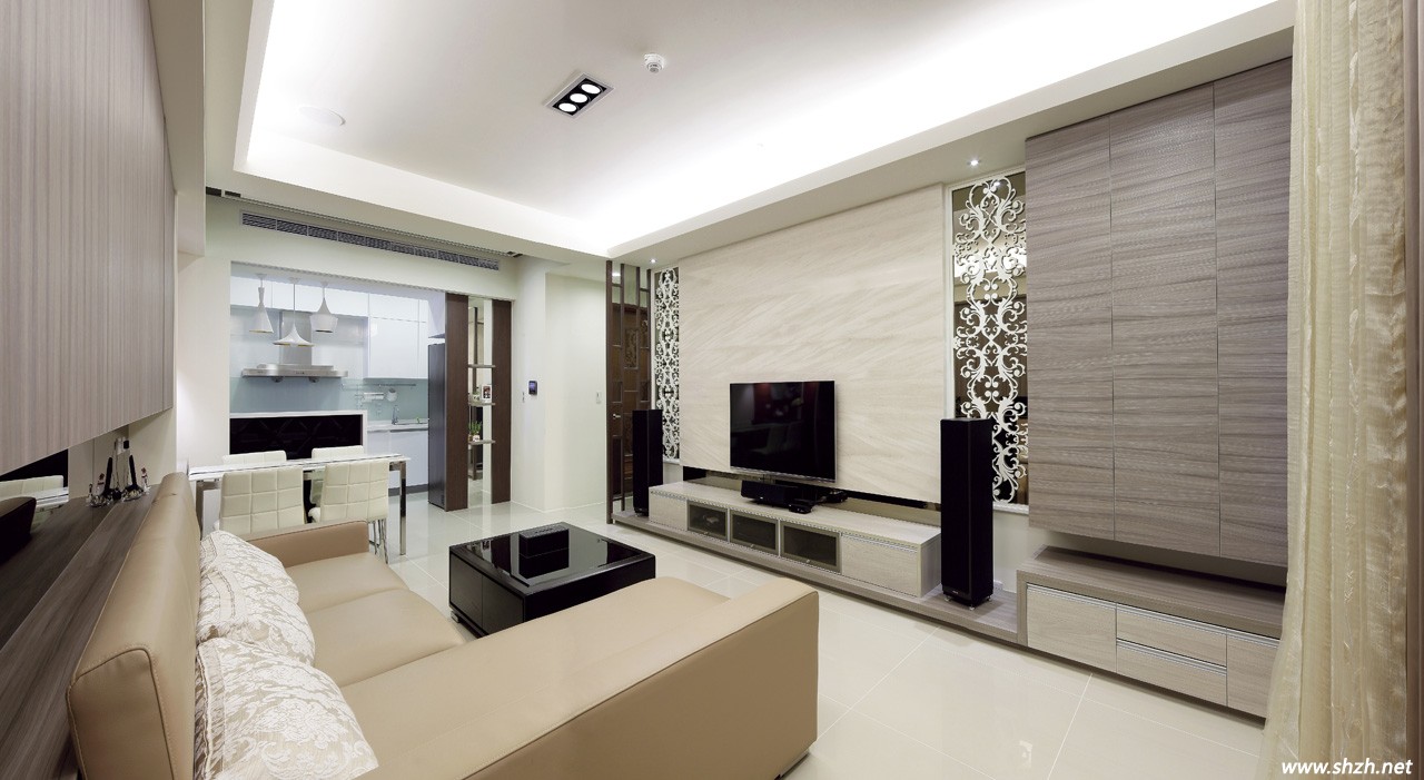 在客廳的設(shè)計中,考慮電視主墻跟玄關(guān)有銜接關(guān)系,于是設(shè)計師藉由大地色柜體與主墻大理石作色彩呼應(yīng),但以質(zhì)地界定出主配角地位。接著在兩側(cè)茶鏡前襯上白色雷射雕刻的窗花來增加造型,如此一來,柔和的色系帶來舒適感受,空間也因方整的柜體確保了簡潔實(shí)用的底蘊(yùn),而曲線柔美的裝飾則回應(yīng)了女主人保留浪漫的心愿。此外,設(shè)計師還利用沙發(fā)上的大梁作墻面統(tǒng)籌,先以中央斷開的上下排系統(tǒng)柜呼應(yīng)電視主墻幅寬,并透過茶鏡反射強(qiáng)化明亮與景深。