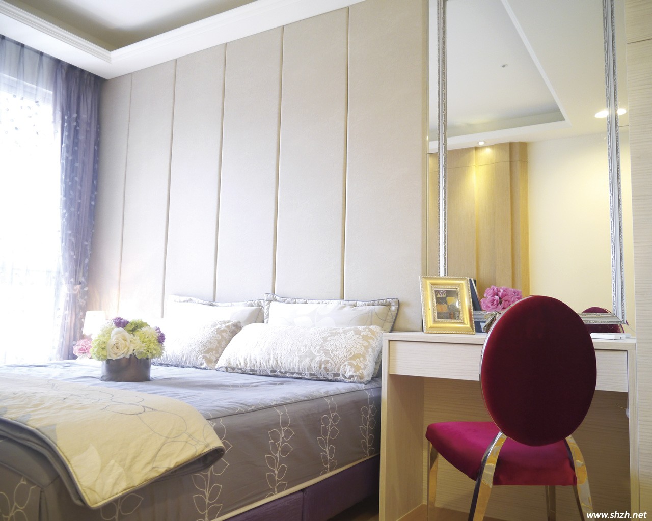 來到臥室中,主臥床頭的淺褐色皮革響應(yīng)公共空間色調(diào),直條的繃板縫隙不僅降低了平面的呆板,瘦長的分割比例也具有拉高墻面的視覺效果。床鋪側(cè)對著更衣室,為使空間有所區(qū)隔,設(shè)計師利用灰玻璃與鏤空的白色窗花結(jié)合,如此一來,臥房的柔軟感倍增,色調(diào)上也與鏡面鑲了銀框的梳妝臺更為融洽。梳妝臺旁利用短墻深度作一個直達(dá)天頂?shù)母吖瘢吖裆隙艘蚤T片遮掩,底部3/4則規(guī)劃成側(cè)拉形式,讓女主人能輕松取用和收納保養(yǎng)品。