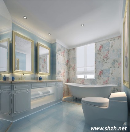 衛(wèi)生間就是很簡單的英式風(fēng)格,在墻上依然使用的是碎花壁紙,淡藍(lán)色的瓷磚,與衛(wèi)生間整體白色一致,為了不使整個衛(wèi)生間看的過于單一,而將鏡子周邊鑲上金色的邊框彰顯英式的貴族氣息。