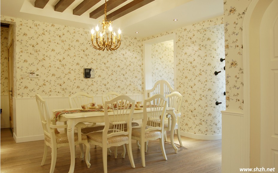 清新淡雅的褐色小碎花壁紙覆蓋整個(gè)客廳,在燈光下盡顯高貴雅致,十分溫馨浪漫,而且表面摸起來很有質(zhì)感。加上白色的桌椅,具有濃厚的歐式田園風(fēng)格,這淡淡的小碎花壁紙給整個(gè)客廳風(fēng)格呈現(xiàn)大自然的氣息。