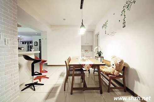 接下來我們再從餐廳的角度來看看吧臺的設置給我們帶來的好處吧,餐廳本身就是一家人吃飯的地方,一般不會使用過多的空間,那在僅僅幾平方的餐廳如何顯得不是那么擁擠,玄關吧臺是最好的裝飾,它沒有直接使用墻面而讓餐廳變得狹小昏暗,也沒有使用玻璃隔斷而產(chǎn)生反光,讓人沒有食欲。與客廳現(xiàn)代簡約風格的設計如出一轍,餐桌也沒采用大理石,玻璃等等,同樣是木質(zhì)的桌椅與整個客廳連在了一起。
