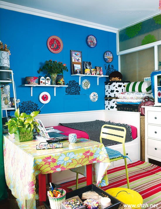一張簡小幽雅的沙發(fā)床,潔白的沙發(fā)上搭配鮮艷的沙發(fā)墊,加上整個深藍色的背景墻,整體會讓狹小的空間很亮麗略帶一點奢華之感,而且層次也很鮮明。墻上,沙發(fā)周圍,桌子上各式有著各樣色彩艷麗的布藝裝飾和帶有民族特色裝飾物點綴,讓整個空間都活躍起來,別是一番風情。