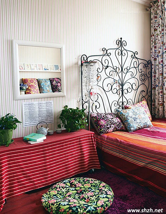 最后看看小臥室的風情吧,藤條形狀的銅藝床頭,床上,地板,床頭柜的顏色都控制在深色系當中,再用稍微淡的墻壁顏色調(diào)和整體感覺。不管墻壁,床單,還是床頭柜上的蓋布都是條紋相間。讓人眼花繚亂,既有現(xiàn)代感,又有雨林的天然感。