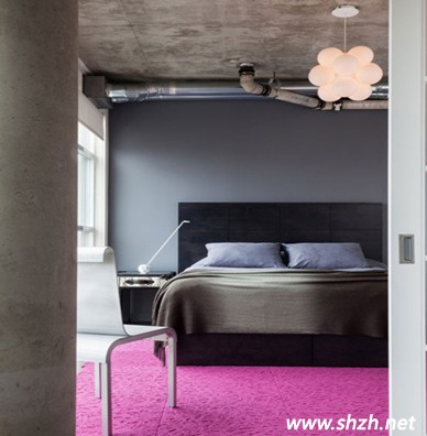 灰色系的房間似乎談冷清了點(diǎn),暗灰色的床鋪和深灰色的墻壁以及水泥材質(zhì)的吊頂,唐人感覺處于冰冷的世界,缺少溫暖。在臥室里面添加一玫紅色的大地毯緩和了臥室冰冷的色調(diào)。增添一份溫馨。