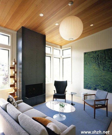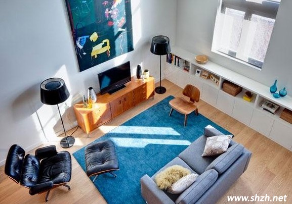 樓層較低的客廳會(huì)讓人覺得壓抑,仿佛一種站不起來的感覺,在視覺上也會(huì)覺得有擁擠的感覺。厚實(shí)的淡藍(lán)色地毯能在無形中減弱這種壓迫感,甚至讓人有誰(shuí)在上面的感覺,輕巧的單椅可隨意移動(dòng)增添了更多的自由。