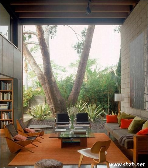 拖過透明的玻璃門,將室外景色搬到家中,在視覺上給人以震撼,但是也讓住家者缺乏安全感,室內(nèi)的裝修一橘黃色為基礎(chǔ)色,所以為了和諧一致,在家中增添橘色地毯,讓人能夠明顯區(qū)分里外景色。