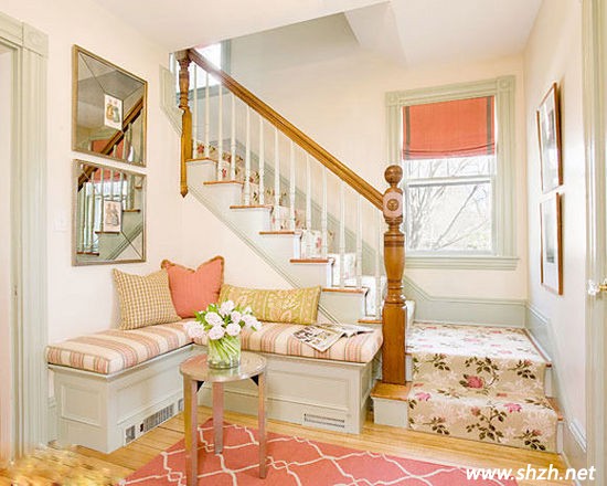 **色的玫瑰花鋪滿了整個樓梯,搭上家具的顏色搭配,打造一副田園甜美風(fēng)格。地毯上精美的花紋與室內(nèi)的色調(diào)相互融合,呈現(xiàn)明亮如春的居家氛圍。