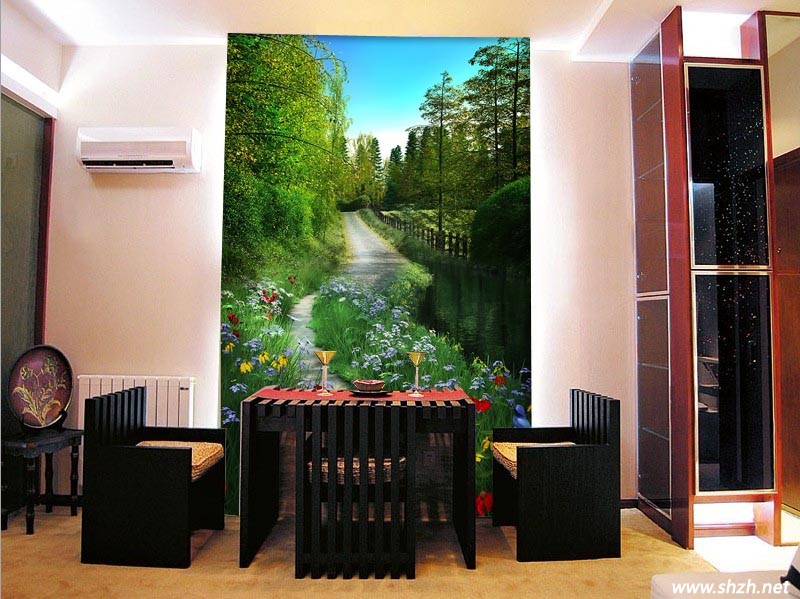 餐廳的背景墻,一般人都是掛上個(gè)性的圖畫來裝飾,但是換上噴繪墻紙呢,效果又是兩樣的吧,在無(wú)形中開闊了餐廳的空間,綿延不斷的小道,鮮艷奪目的野花,綠色的樹木,都給餐廳增加實(shí)實(shí)在在的春色。
