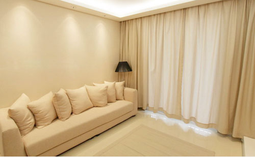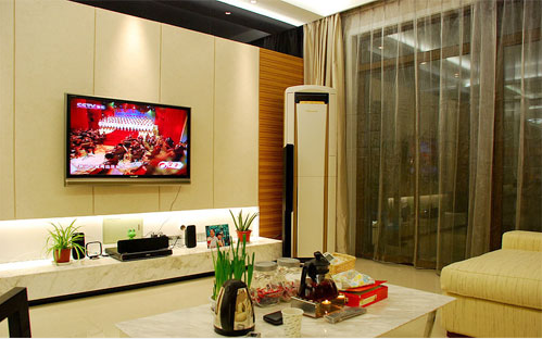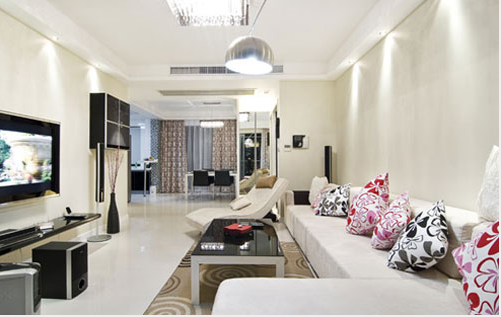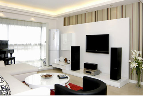 大面積的黑色烤漆玻璃和黑色系的電視機(jī),音響與淺色系的和諧、統(tǒng)一形成了鮮明的對比,給人一種時(shí)尚氣息。米色的沙發(fā)搭配簡單的小碎花靠墊給人舒適溫暖的感覺,使簡約中又不失溫馨。