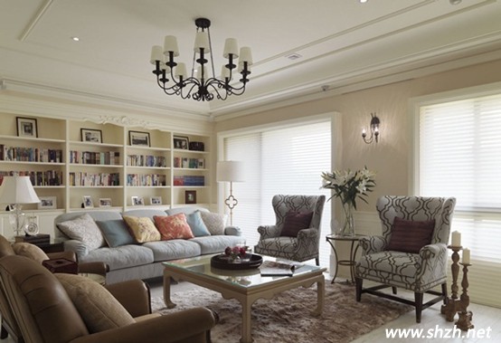 鐵制吊燈與深色皮革矮桌搭配淺色沙發(fā),對(duì)比色調(diào)讓空間表情豐富多元。而且還流露出一股歐式貴氣之風(fēng)。