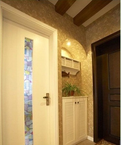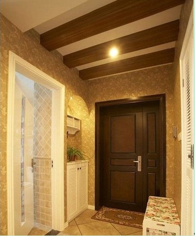 進門雪白的2扇百葉門成品鞋柜,上面的裝飾吊柜,拱形上的筒燈,大面積的墻紙鋪貼,進門的木柱吊頂,經(jīng)典的美式復(fù)古風(fēng)!