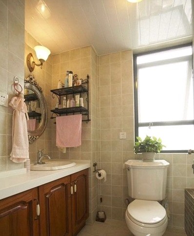衛(wèi)生間中木質(zhì)的臺盆柜PVC扣板吊頂150*150的米黃色磚鋪貼是經(jīng)典的美式復(fù)古風(fēng)格的詮釋!