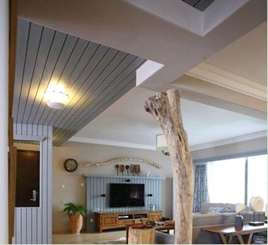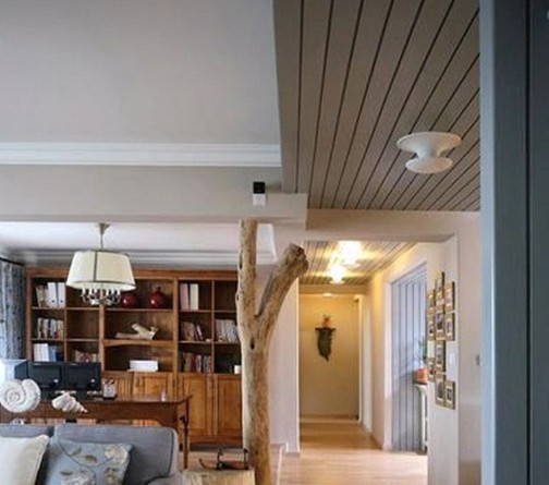 看這張圖片大家的第一感覺是不是是感覺這棵樹是不是有點像本不屬于這個空間,但是本案設(shè)計卻無獨有偶,把本不屬于空間的東西完美的安插在這個空間當中,走道的木質(zhì)格柵吊頂,休閑區(qū)域的成品書柜!完美的勾勒出了原生態(tài)溫馨家居的美!