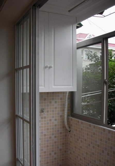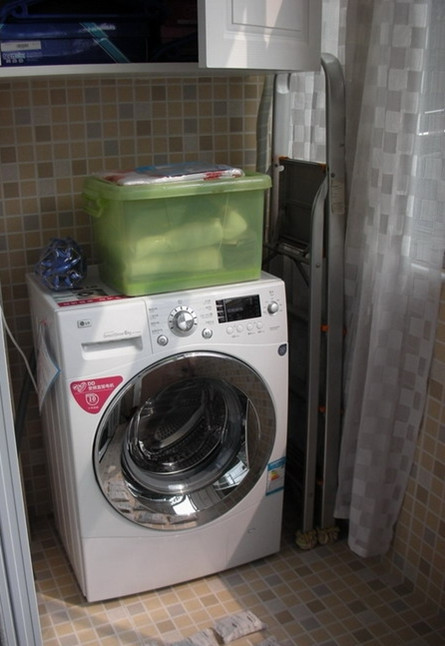 客廳外的陽(yáng)臺(tái)上,洗衣機(jī)置放在這里,解決了衛(wèi)生間面積小的問(wèn)題