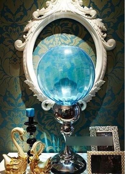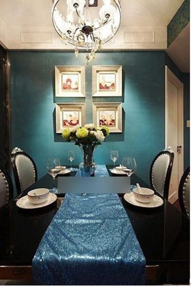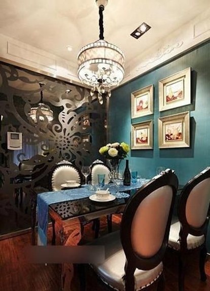 餐廳的吊燈是水晶的,這是不能錯(cuò)過(guò)的,整面墻是帶點(diǎn)藍(lán)色的。
