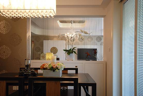 如果把廚房做成局部開放,只有一個窗臺大小的位置和餐廳相通的話,這樣防油煙的效果會比較好,炒菜時可以用玻璃、簾子或者其他東西遮擋一下,等做飯完畢油煙排干凈再把擋板拿開,也是一種方法。
