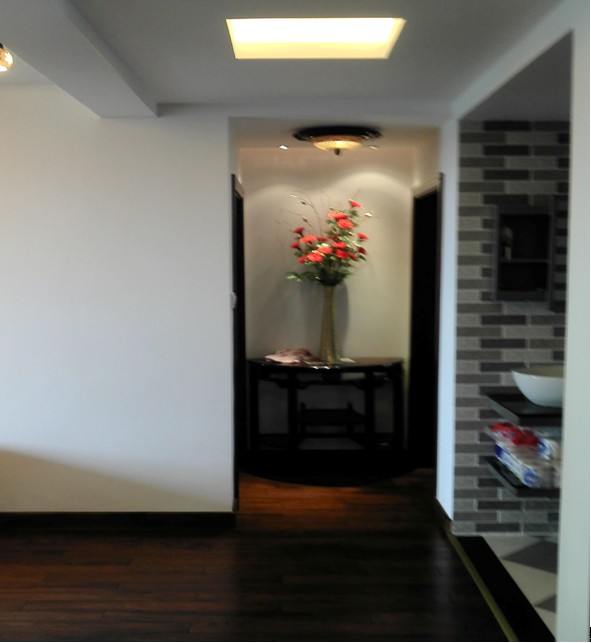 這是進(jìn)門區(qū)域的實(shí)景圖片右邊是客廳區(qū)域左邊是干濕分區(qū)的衛(wèi)生間區(qū)域進(jìn)門當(dāng)中是一個裝飾擺設(shè)架上面有裝飾,整體感覺空間一點(diǎn)都不單調(diào)!右邊的仿古文化石正體現(xiàn)出了古典風(fēng)格中以古典襯托風(fēng)格,天地方圓頂上的方形吊頂及米黃色燈帶都體現(xiàn)出了中國的古典文化及溫馨的感覺!
