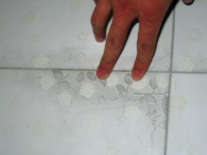 據(jù)何鐵柱敘述,裝修的時候,為避免地磚被硬物劃傷,他曾用廢紙箱蓋在地磚上,勾地磚縫時,便發(fā)現(xiàn)有些地磚花了,就像被磨漏后沾了臟東西。因為還沒有裝門、吊頂、櫥柜及燈具,所以他又用廢紙箱將地磚保護(hù)起來??傻鹊降蹴斞b完后,他發(fā)現(xiàn)花的地磚更多了,也花得更厲害了。
