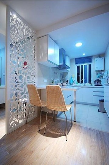 簡(jiǎn)約的風(fēng)格在廚房空間里顯得淋漓盡致,清藍(lán)色的燈光將空間打造的清新典雅。廚房里設(shè)有一個(gè)吧臺(tái),不想做大餐的晚上可以在這里將就一下,也不用再特地收拾一下餐桌了。進(jìn)入廚房的這個(gè)別致的鏤空隔斷,又為空間里增加一些時(shí)尚氣息。