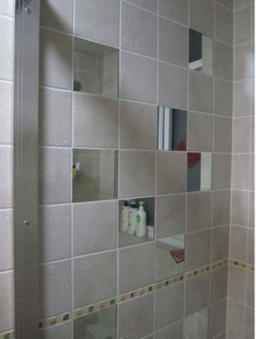 這是衛(wèi)生間淋浴房的一面墻,從墻面上摻插的鏡子墻面來看,收納儲(chǔ)物空間皆是有續(xù)的。