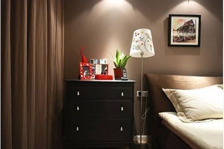 窗簾亦是咖啡色系的,這個(gè)床頭落地抬燈秀氣別致。床頭柜則是較為實(shí)用的選擇,可以作為儲(chǔ)物空間,一些珍貴物品或易醉物品皆可放在這個(gè)固定的場(chǎng)所。
