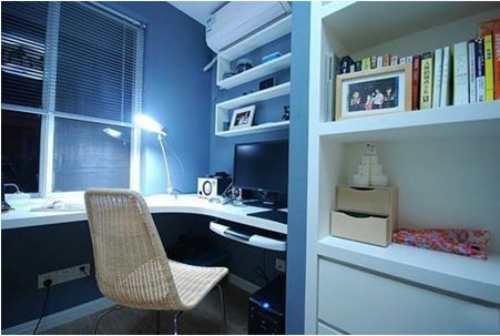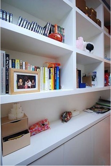書房里做了一面書架墻,雖然這樣使本來就空間不大的書房更顯得小一些,不過這個(gè)收納空間非常實(shí)用,而且易清理,保存功能也很好。下排柜是一層柜門的,除了書本還可收納其它物品。