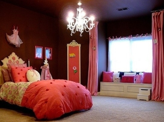 紅色是熱情的,熱情如火的紅。整個臥室都以紅色為基調(diào),或深或淺,熱情四溢。墻壁上裝飾的小公主裙,各色小花,以及帶立體圓球的被子,使得公主臥室非??蓯?。