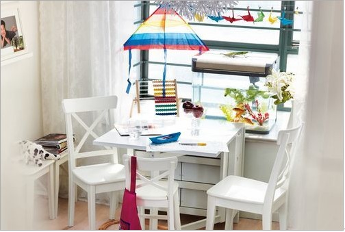 流線型設(shè)計(jì)的書桌椅,純凈自然。五顏六色的風(fēng)箏、紙鶴在綠色窗體的襯托下變得絢爛起來,為空間營造出小巧又亮麗的景致,整個(gè)空間都充滿北歐風(fēng)格的簡潔和自然美感。