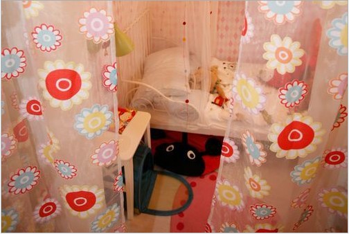 質(zhì)感如紗的艷麗隔斷簾,讓空間變的甜蜜而夢(mèng)幻,圓形花朵的圖案別具一格,色調(diào)甜美的色彩給空間帶來絲絲溫暖、輕巧活潑。顏色和床品營造出既靈活又溫馨的睡眠環(huán)境。
