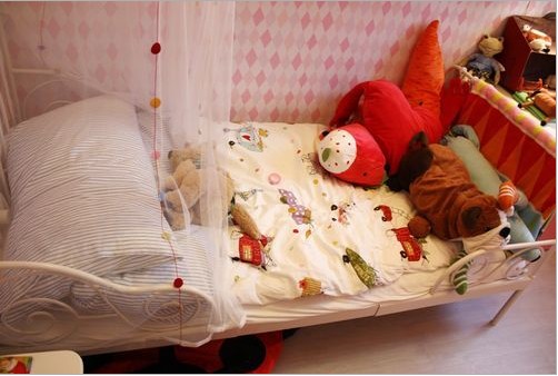 柔和的燈光,艷麗的色彩,都很好的緩和了鐵藝帶給人的冷漠感。床上凌亂的放著小朋友的玩偶,小小的它們可以成為家中的一個(gè)亮點(diǎn),賦予空間更多的靈性與時(shí)尚感。