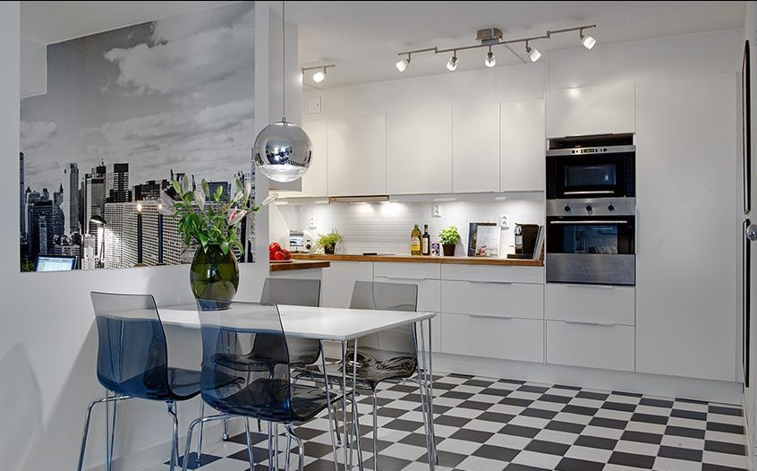 半開放式的廚房里,小餐廳就在這里,餐桌上的綠色在潔凈的空間里更顯得清新浪漫。類似于國際象棋盤一樣的地磚卻又能給我們帶來濃濃的懷舊情結(jié)。在不相配的元素搭配下卻能成就一個和諧的空間,這就是現(xiàn)代簡約的魅力。